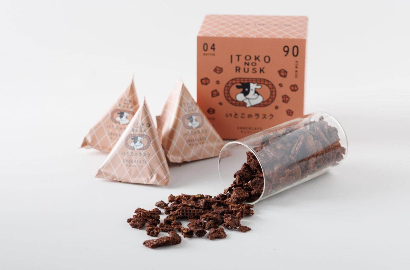 バターのいとこのチョコ味を成型する際に出る、ゴーフレット生地の端っこを利活用し、こんがり焼き上げたチョコラスク。ふわっと香るバターと、ビターなカカオの味わいがちょっぴり大人な味わいで大人気です。