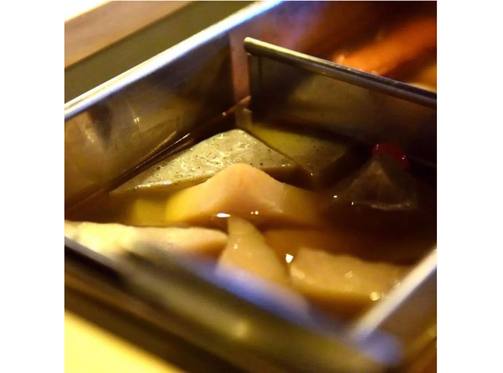 蒟蒻を含むおでん種、5種盛りと日本酒