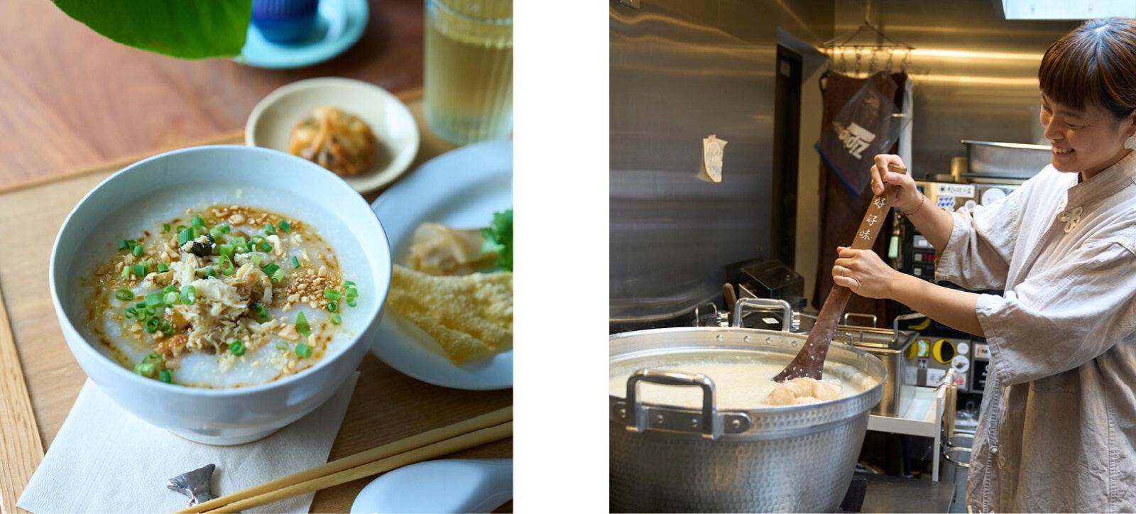 自社農園のある滋賀県で開発された『みずかがみ』というお米、兵庫県淡路島産の小エビ、香川県産『やまくに』さんのいりこ、北海道サロマ湖産の乾燥ホタテの貝柱などをオリジナルでブレンド。国産食材にこだわり、日々丁寧に三時間かけてお粥を炊いています。