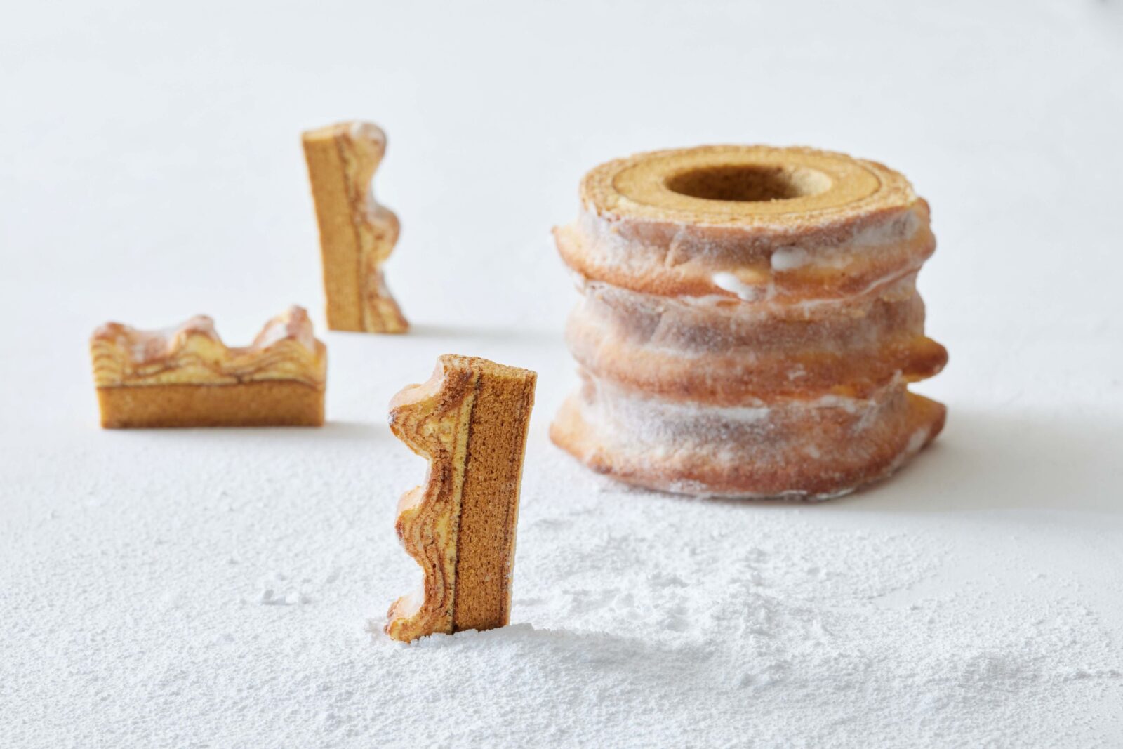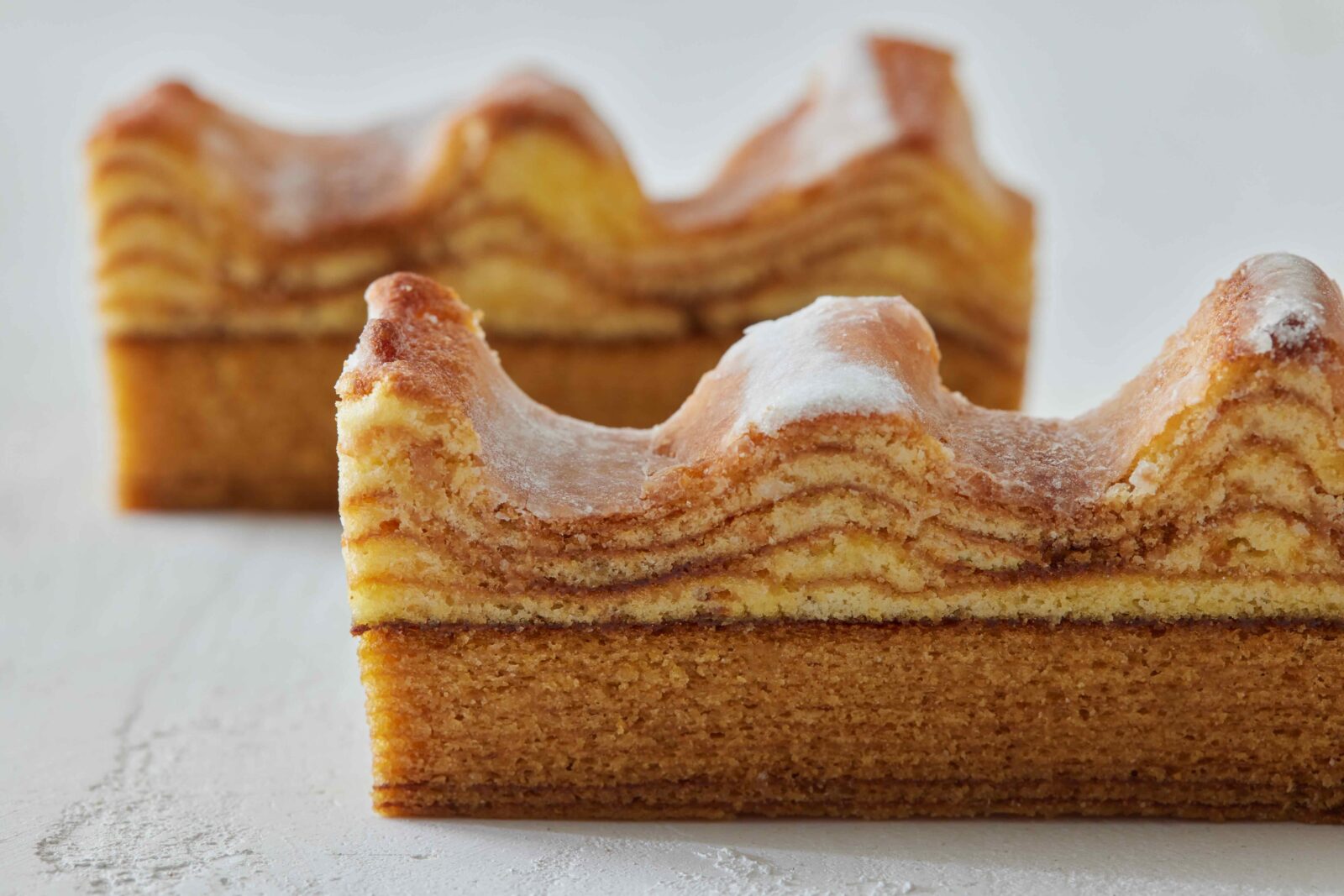 バームクーヘンを二層に重ねて焼くことで、今までのバームクーヘンにはなかった味わいと食感の重なり合いが楽しむことができます。