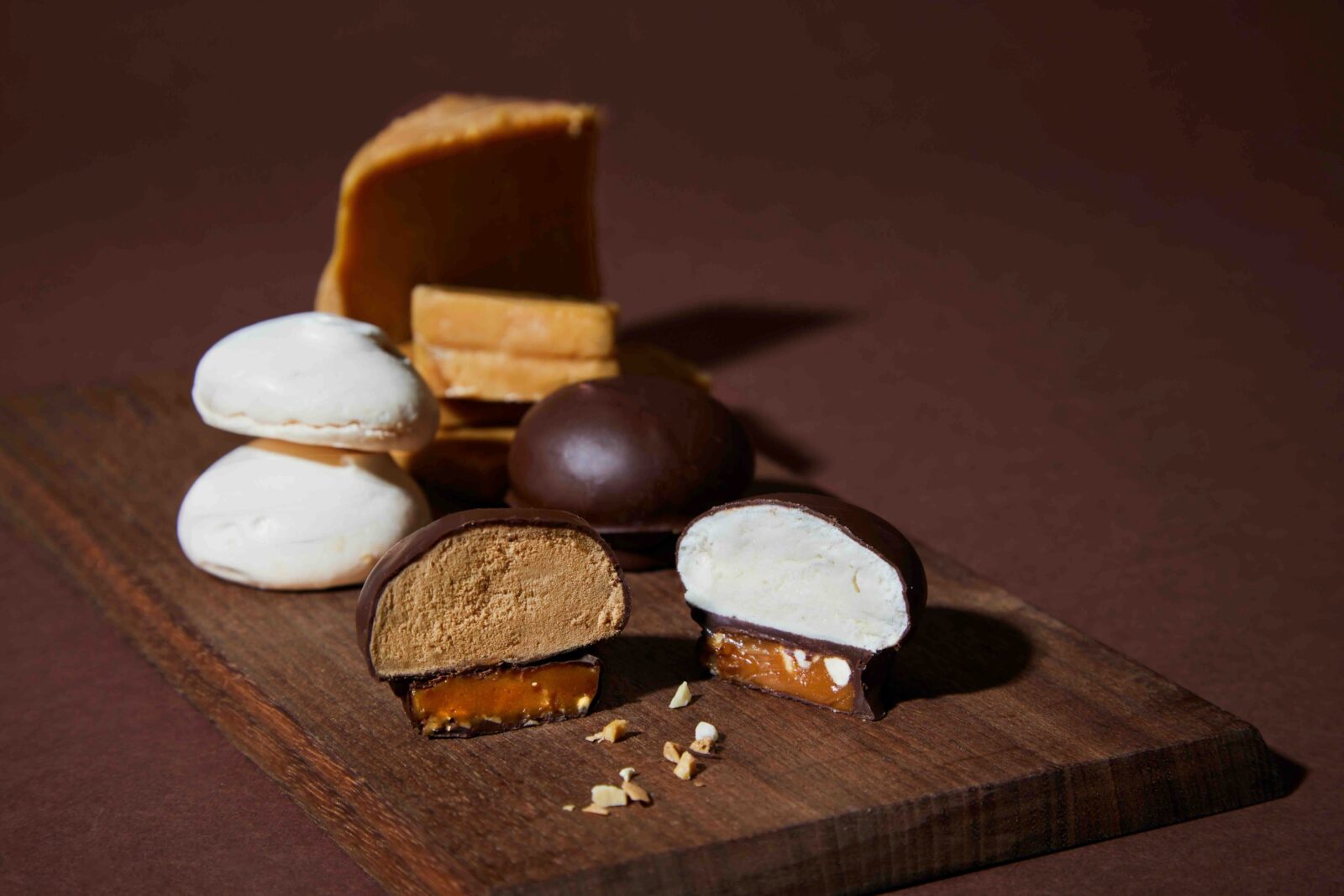 ブラウンチーズと、ふわっと軽やかなメレンゲ、その周りを包みこむなめらかなチョコレート。まったく異なる素材が重なりながら、口に入れた瞬間、3つのとろけるがひとつに。ころん、とまぁるい手のひらにのる愛らしいフォルムが特徴です。